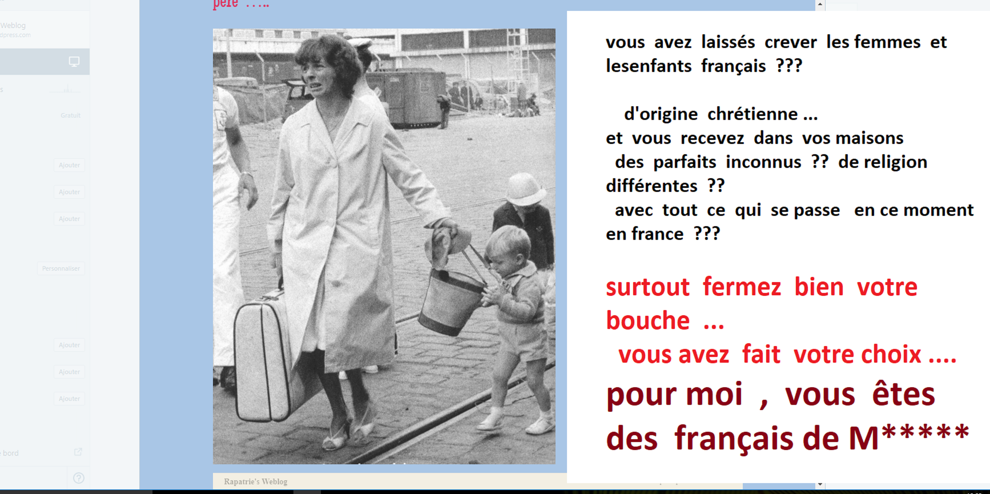 ça date pas d’hier ;regardez comme ils acceuillaient ; leurs propres enfants , ils ont fait pour les militaires (la jeunesse ) comme ils ont fait pour les rapatriés , lisez pour comprendre , comment les vrais français veulent voir mourir leurs propres frères